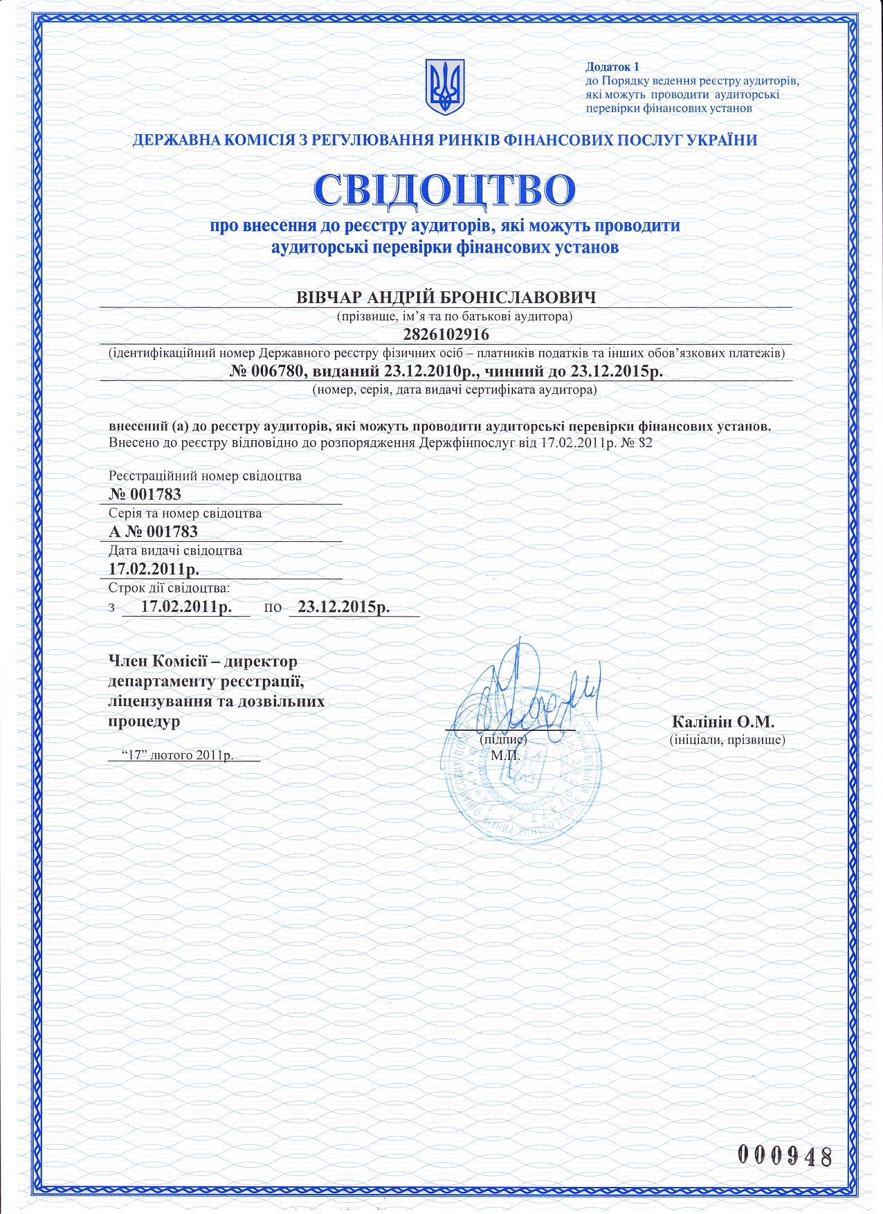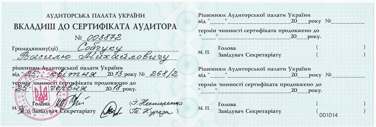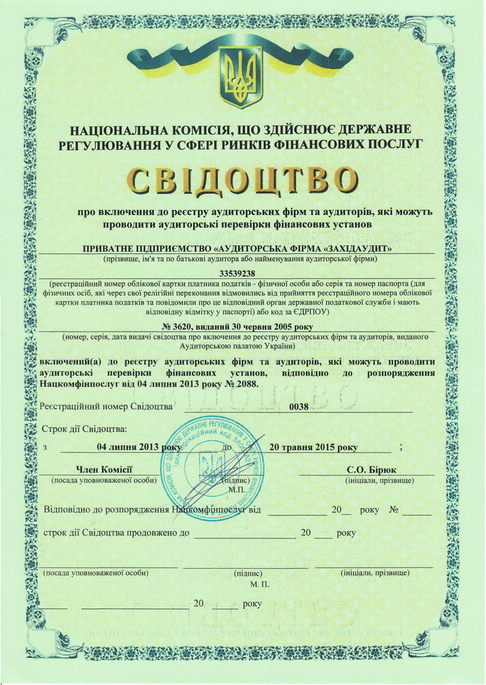 - Свідоцтво про внесення до реєстру аудиторів для перевірки фінансових установ серія А № 001783 від 17.02.2011 р. (Держкомфінпослуг)