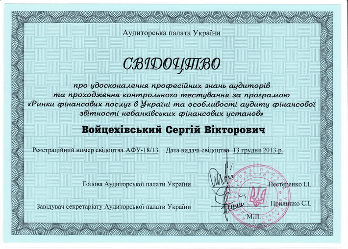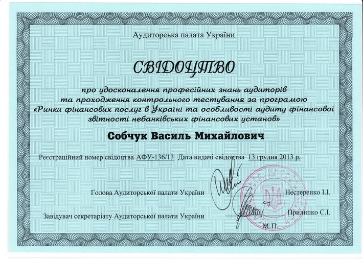 - Свідоцтво про удосконалення професійних знань № АФУ-18/13 від 13.12.2013 р.