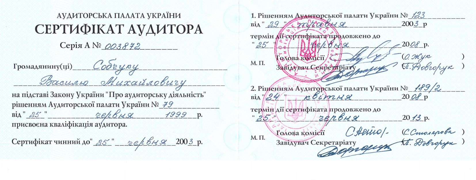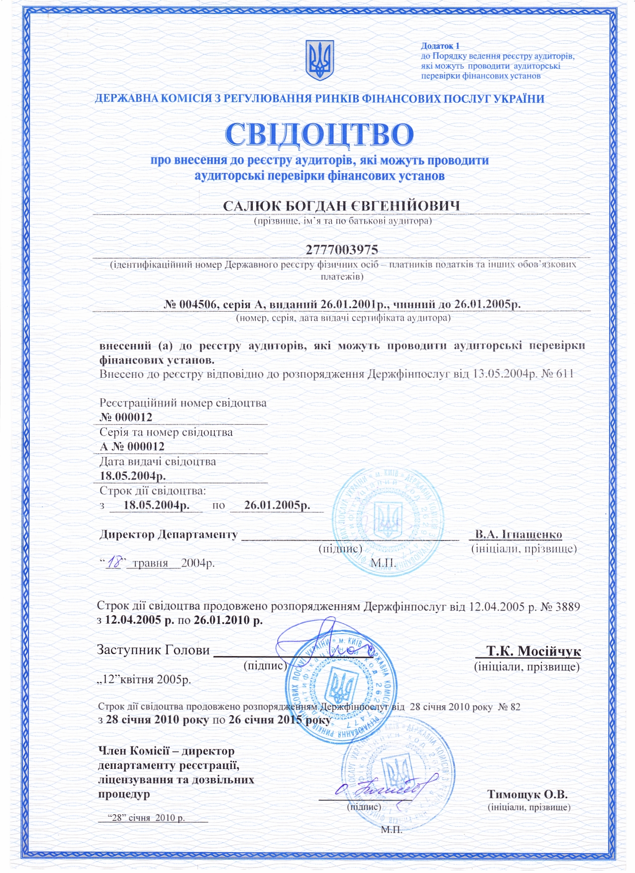 - Свідоцтво про внесення до реєстру аудиторів для перевірки фінансових установ серія А № 000012 від 18.05.2004 р. (Держкомфінпослуг)