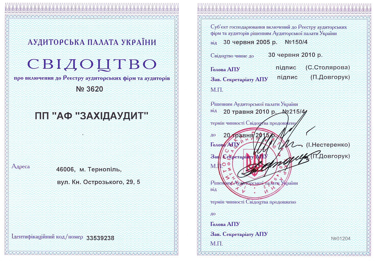 - Свідоцтво про включення до реєстру суб’єктів аудиторської діяльності № 3620 від 30.06.2005 р. (АПУ)