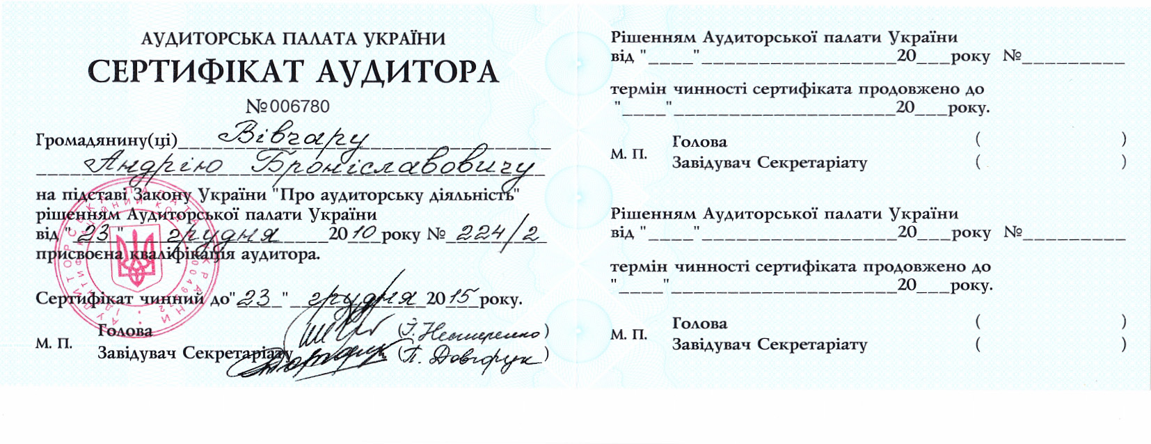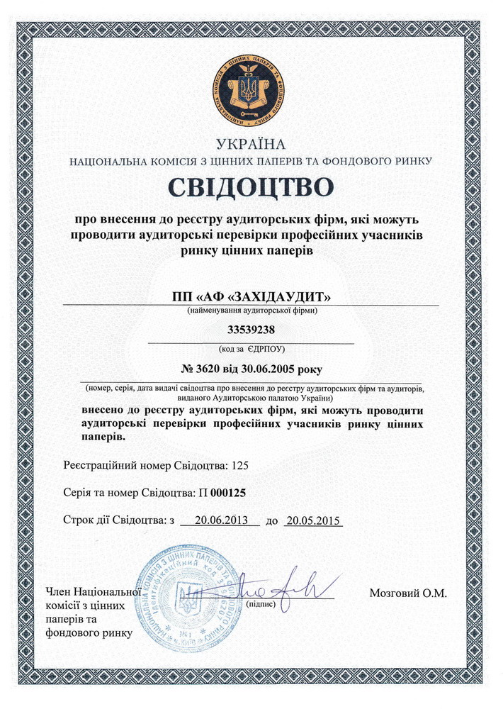 - Свідоцтво про внесення до Реєстру аудиторів для перевірки фінансових установ на ринку цінних паперів серія АБ № 001093 від 10.08.2010 р.