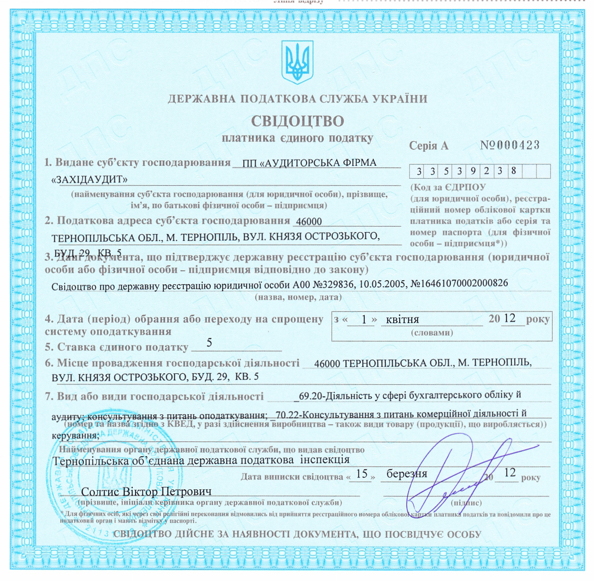 - Свідоцтво платника єдиного податку серія А № 000423 від 15.03.2012 р.