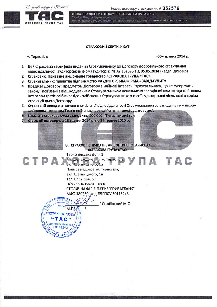 Професійна відповідальність аудиторів застрахована згідно з вимогами законодавства, що гарантує захист інтересів клієнтів.